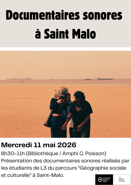 Pour rappel du 24 au 26 mars 2026, les étudiant.es du parcours « géographie sociale et culturelle » en 3e année de Licence en géographie se sont rendu.es à Saint Malo dans le cadre de l’atelier d’initiation à la recherche. Ils ont réalisés des observations sur le terrain et des entretiens avec des actrices et acteurs locaux, mais également des prises de son en vue de monter un documentaire sonore d’une dizaine de minutes. Le grand vent ne les a pas freiné.es !